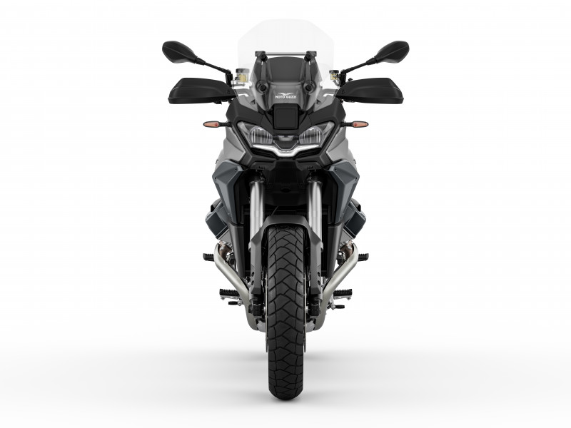 Son design unique allie robustesse, compacité et puissante, avec des caractéristiques distinctives telles que le moteur V-Twin "Compact Block", le bras oscillant unilatéral et les feux de jour en forme d'aigle, soulignant l'héritage Moto Guzzi.